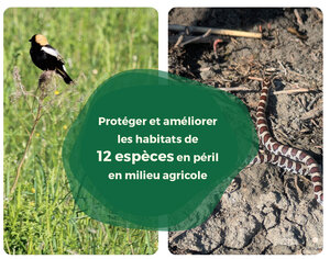 En partenariat avec ALUS Montérégie et d’autres acteurs régionaux, la Fédération continue d’accompagner les productrices et producteurs dans l’adoption de pratiques bénéfiques à la biodiversité, telles que la fauche retardée du foin pour les oiseaux champêtres et l’ensemencement de bandes fleuries pour les pollinisateurs. Un guide pratique a été publié pour appuyer les aménagements destinés aux pollinisateurs. Par ailleurs, un suivi des aménagements pour la couleuvre tachetée, en collaboration avec Connexion nature, a été amorcé et une stratégie de marketing social a été déployée en collaboration avec le Zoo de Granby pour soutenir les efforts de conservation du Goglu des prés, de la Sturnelle des prés et de l’Hirondelle rustique.