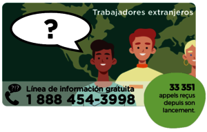 Le CEA a le mandat d’Immigrant Québec d’offrir une ligne téléphonique de référencement spécialement dédiée aux travailleurs migrants du Québec. En composant le 1-888-454-3998 ou en utilisant WhatsApp au 438-543-5062 ou au 438-378-5152, les travailleurs étrangers temporaires peuvent obtenir des réponses à leurs questions sur une variété de sujets et être orientés vers les services appropriés.