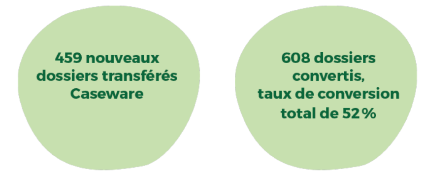 Le reste des conversions sera effectué au cours de la prochaine année, puisque depuis mai 2025, l’ensemble de nos dossiers en Montérégie est désormais préparé à l’aide de ce nouveau logiciel. L’intégration du logiciel a exigé un investissement important en temps et en formation pour l’équipe.